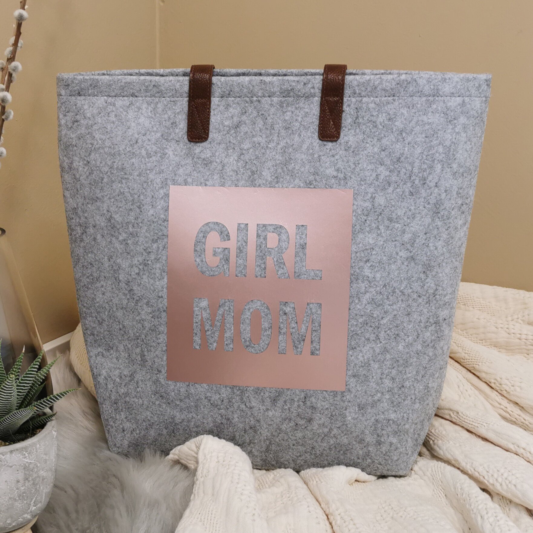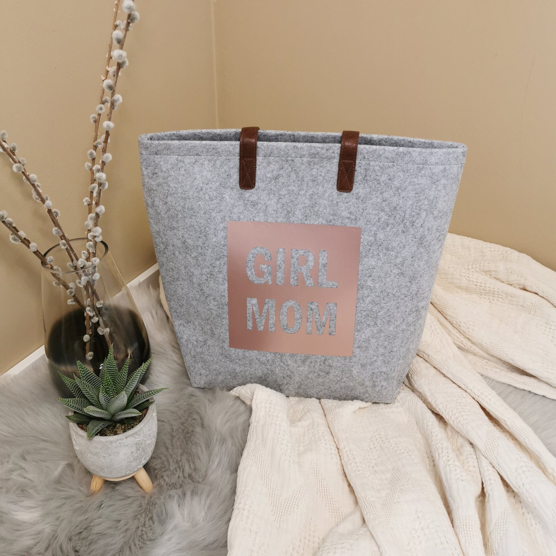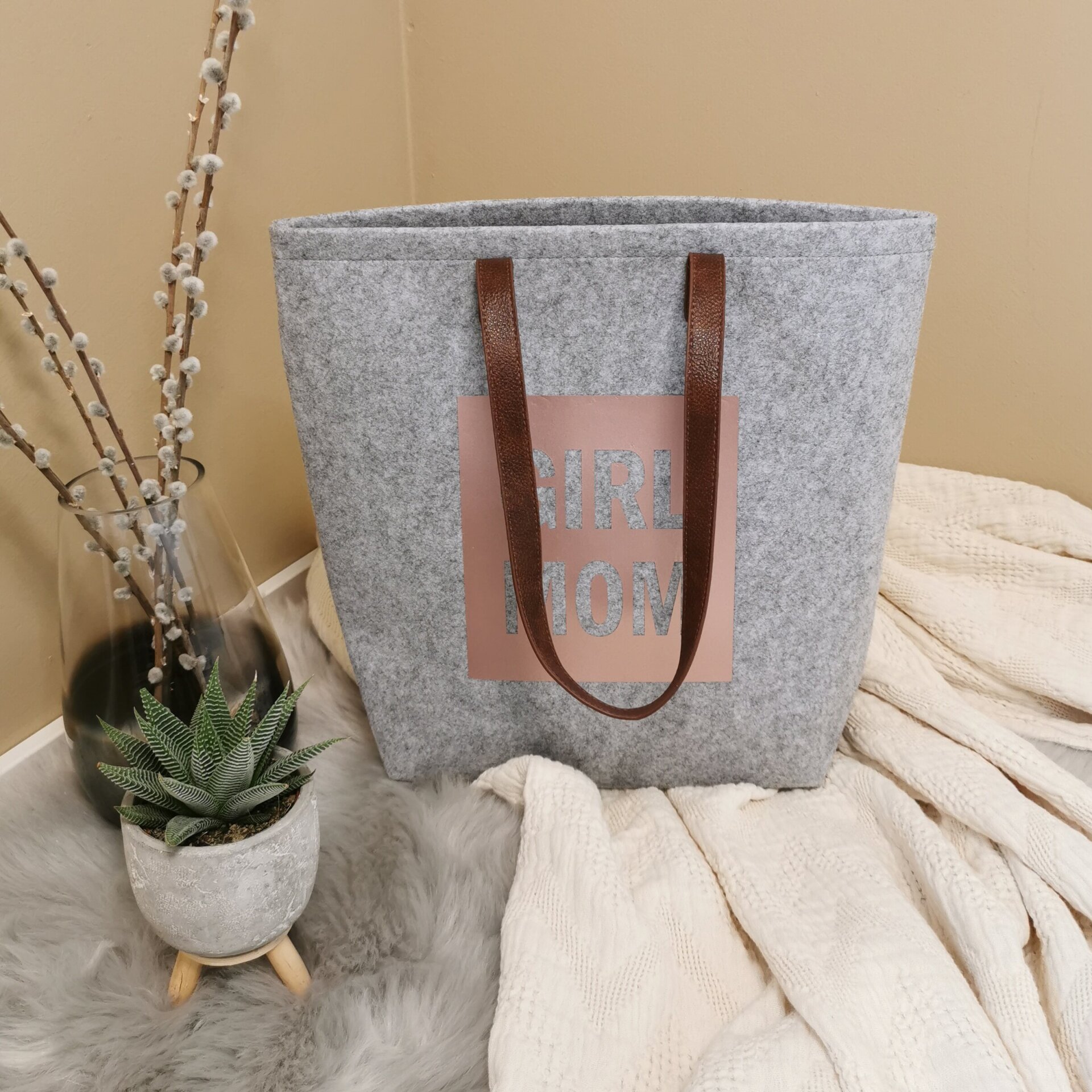 Dieser stilvolle Filz-Shopper ist der perfekte Begleiter für alle stolzen Girl Moms. Das moderne „GIRL MOM“-Motiv in schimmernden Roségold macht die Tasche zu einem echten Hingucker im Alltag, beim Play-Date oder auf dem Spielplatz.
