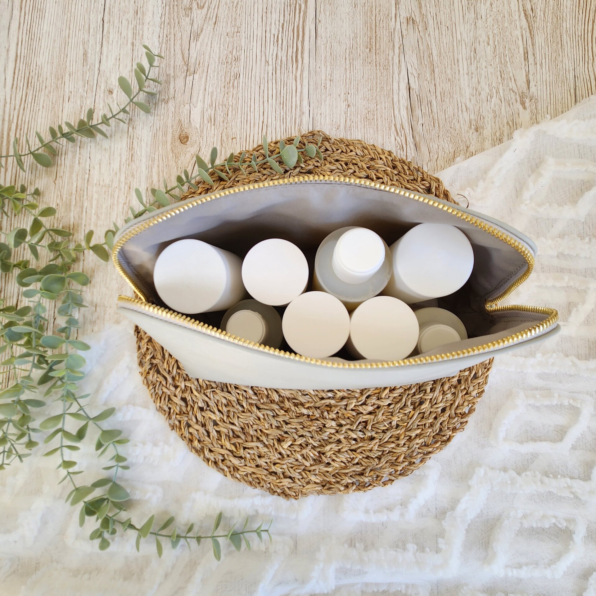 Das robuste Kunstleder sorgt für Stabilität, ohne dass die Tasche steif wirkt – sie lässt sich platzsparend einpacken und schützt Kosmetikprodukte zuverlässig. Die Außenfläche ist leicht abwischbar, das Innenfutter kann einfach mit einem feuchten Mikrofasertuch oder einem speziellen Textiltuch gereinigt werden.