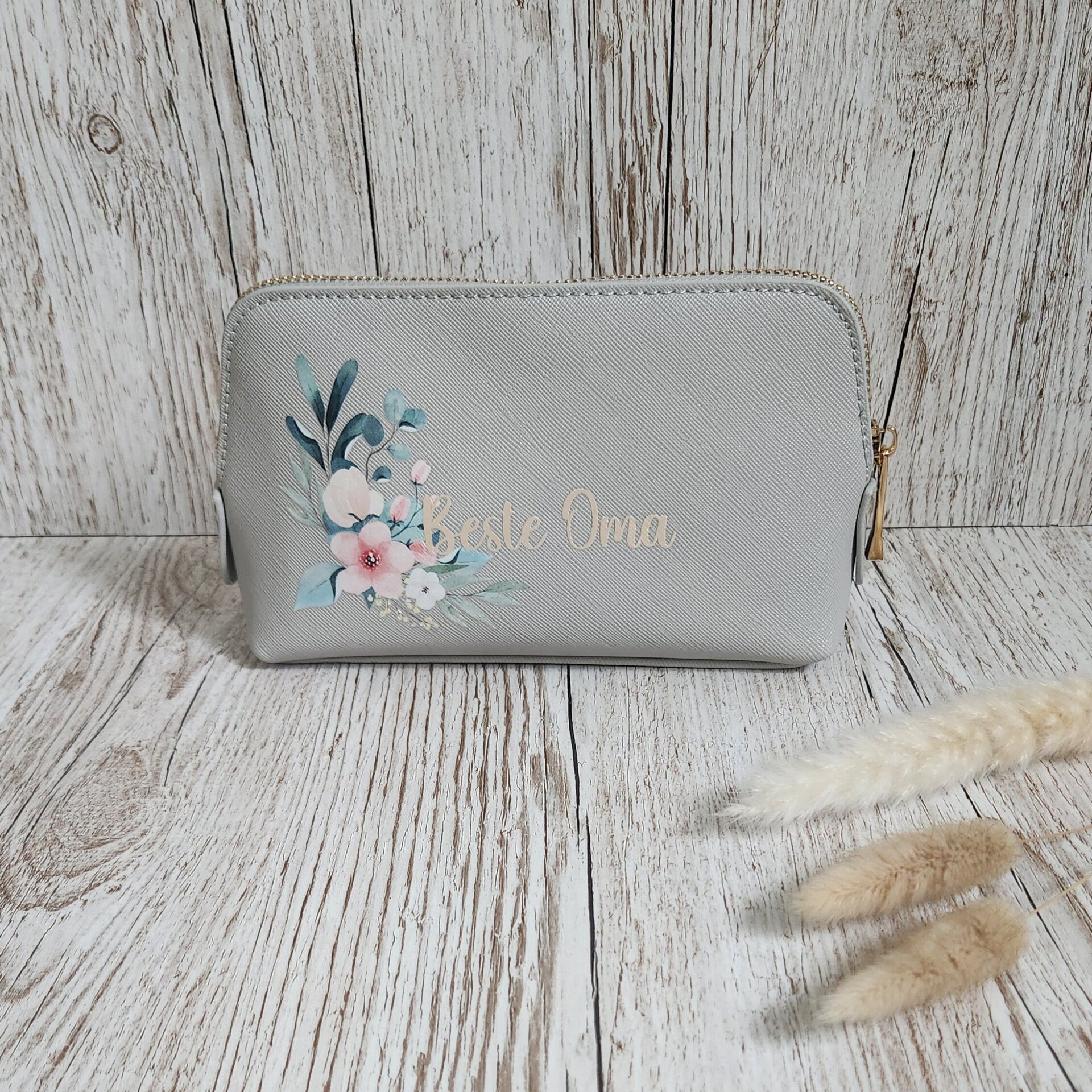 • Kosmetiktasche aus hochwertigem Kunstleder in grau mit goldenem Reisverschluss