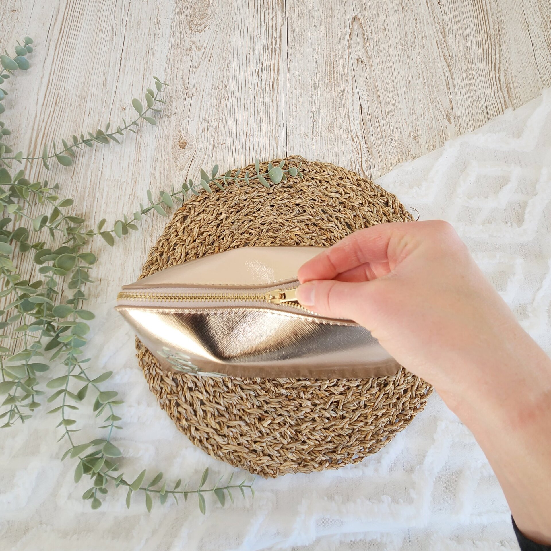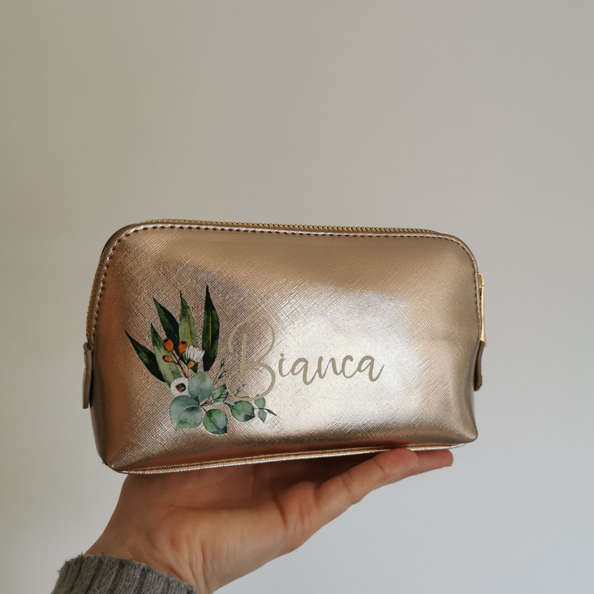 • Kosmetiktasche aus hochwertigem Kunstleder in roségold mit goldenem Reisverschluss