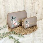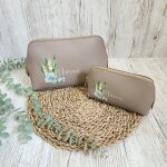 Die große Kosmetiktasche bietet ausreichend Platz für Pflegeprodukte wie Cremen, Shampoo oder Zahnpasta, während die kleine Variante ideal für Make-up, Haaraccessoires oder als Reiseapotheke geeignet ist. Ob als praktisches Reise-Accessoire oder als individuelles Geschenk für Frauen – diese personalisierte Kosmetiktasche überzeugt mit Qualität, Design und Funktion.
