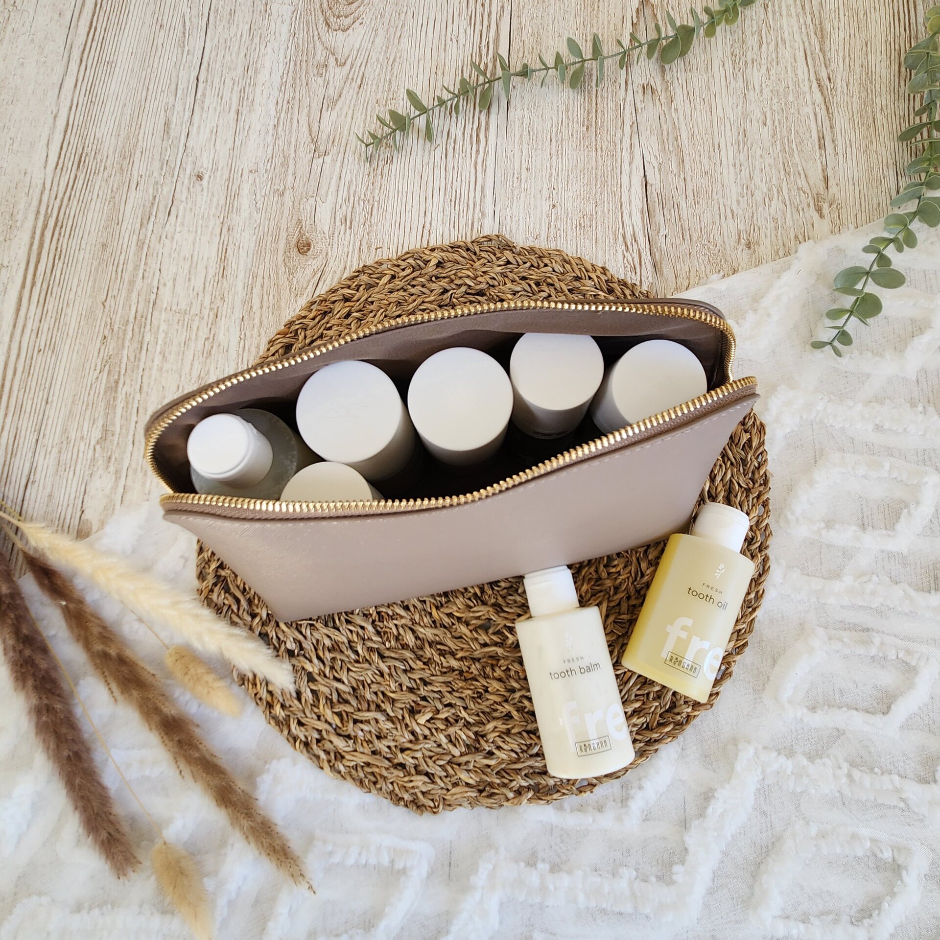 Das robuste Kunstleder sorgt für Stabilität, ohne dass die Tasche steif wirkt – sie lässt sich platzsparend einpacken und schützt Kosmetikprodukte zuverlässig. Die Außenfläche ist leicht abwischbar, das Innenfutter kann einfach mit einem feuchten Mikrofasertuch oder einem speziellen Textiltuch gereinigt werden.