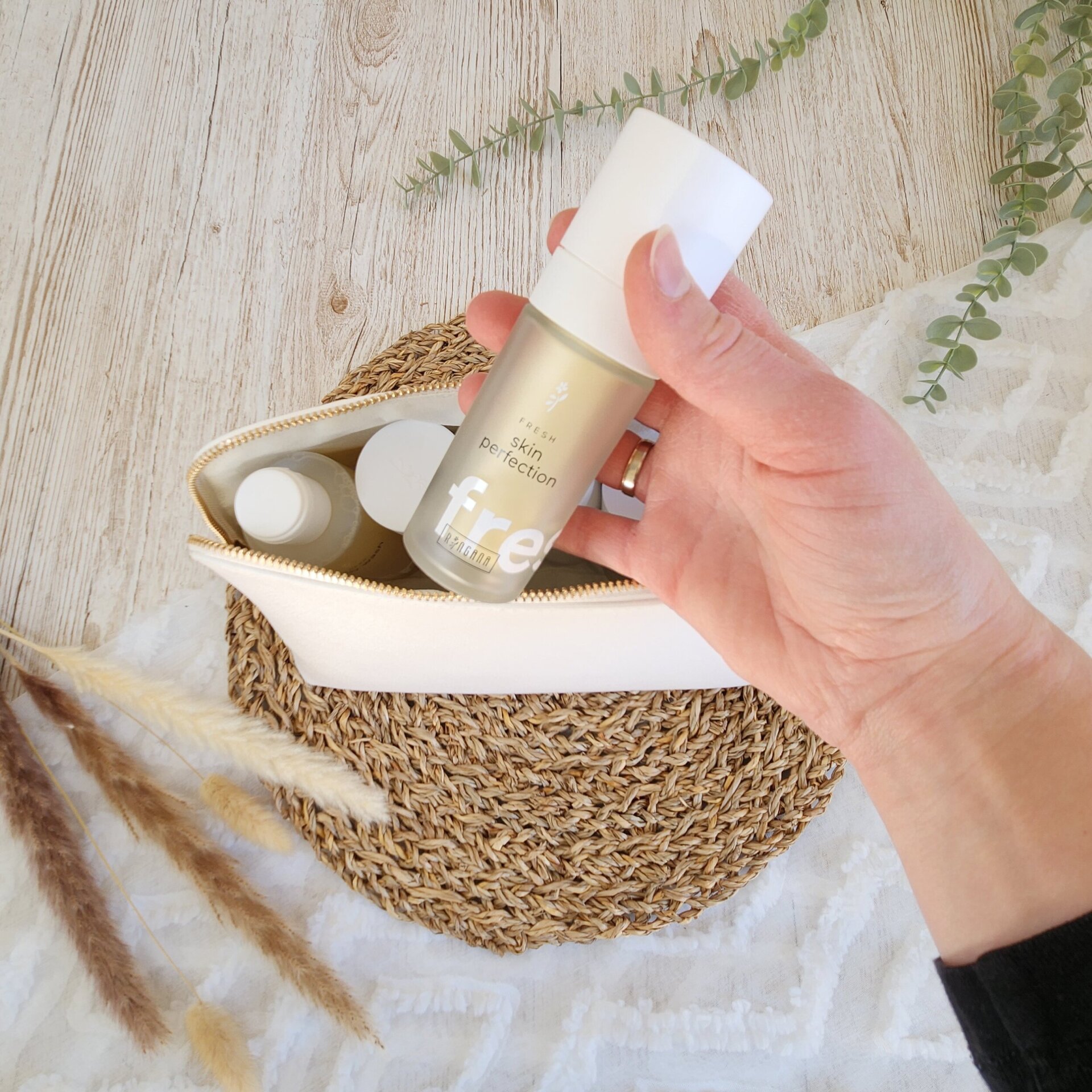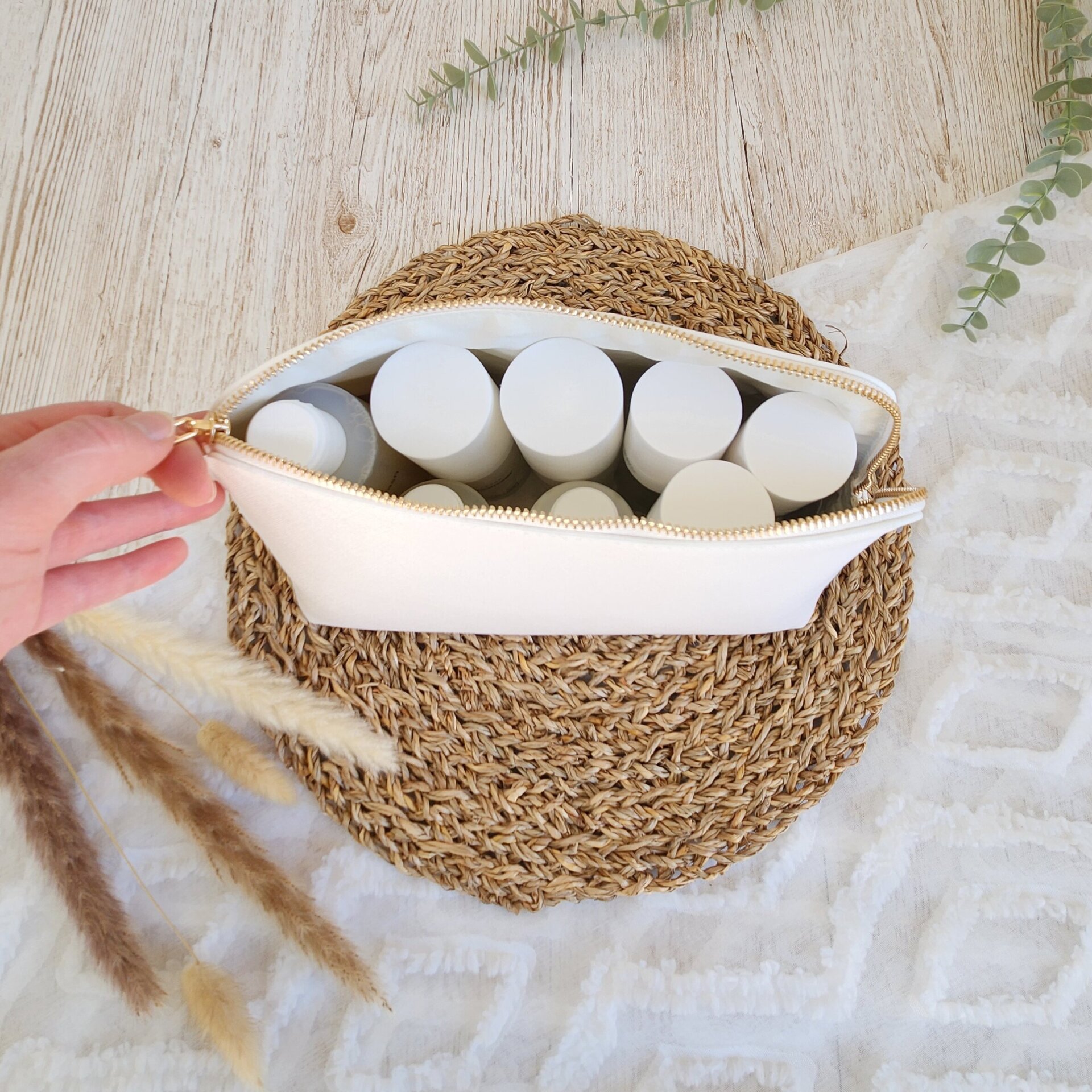 Das robuste Kunstleder sorgt für Stabilität, ohne dass die Tasche steif wirkt – sie lässt sich platzsparend einpacken und schützt Kosmetikprodukte zuverlässig. Die Außenfläche ist leicht abwischbar, das Innenfutter kann einfach mit einem feuchten Mikrofasertuch oder einem speziellen Textiltuch gereinigt werden.