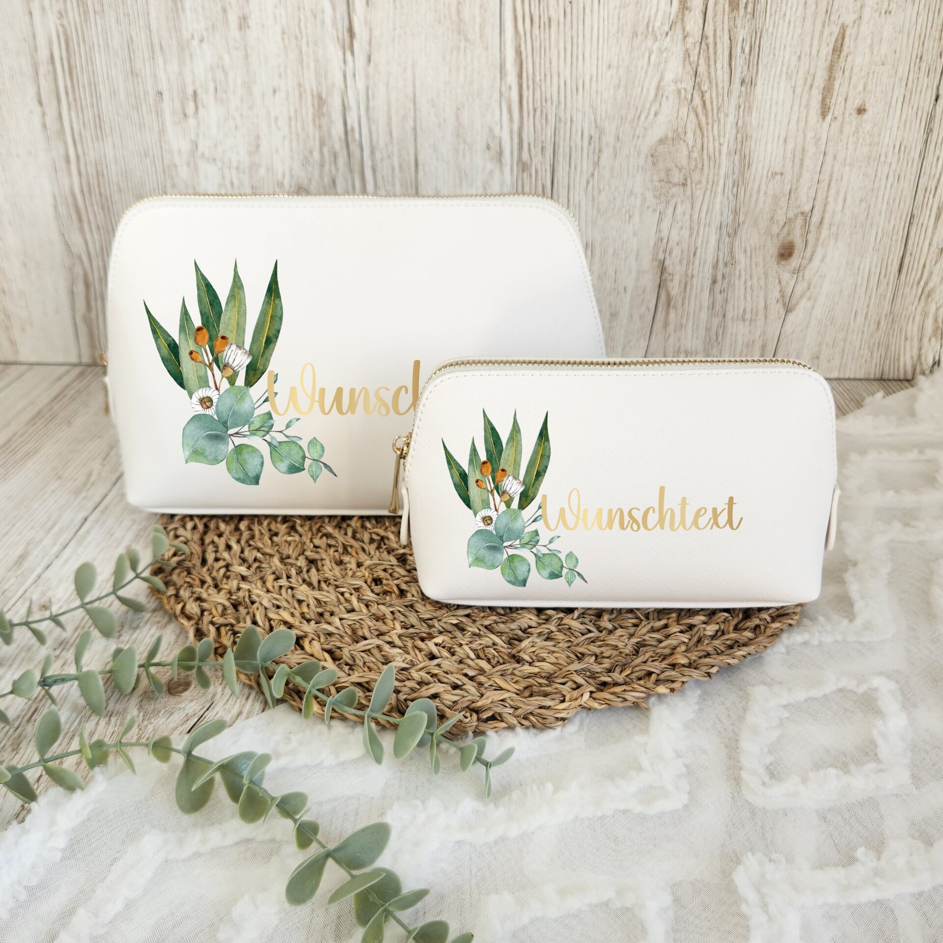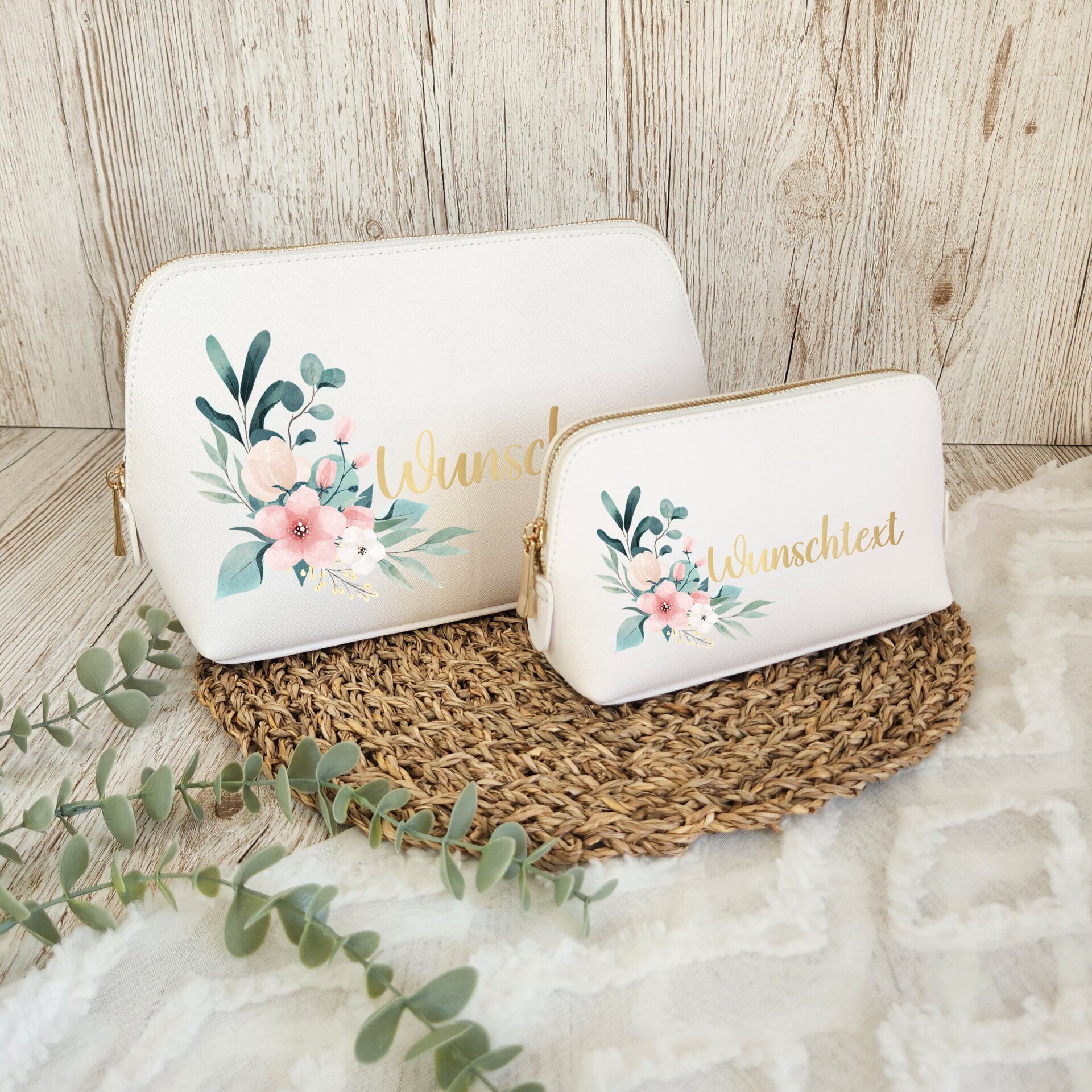 Die große Kosmetiktasche bietet ausreichend Platz für Pflegeprodukte wie Cremen, Shampoo oder Zahnpasta, während die kleine Variante ideal für Make-up, Haaraccessoires oder als Reiseapotheke geeignet ist. Ob als praktisches Reise-Accessoire oder als individuelles Geschenk für Frauen – diese personalisierte Kosmetiktasche überzeugt mit Qualität, Design und Funktion.