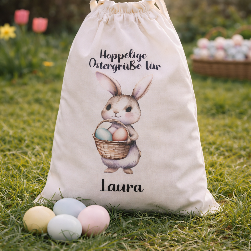 Dieser personalisierte Osterbeutel macht die Ostereiersuche für Kinder noch besonderer. Der liebevoll gestaltete Baumwollbeutel wird mit dem Namen des Kindes personalisiert und sorgt so für ein ganz persönliches Osternest.