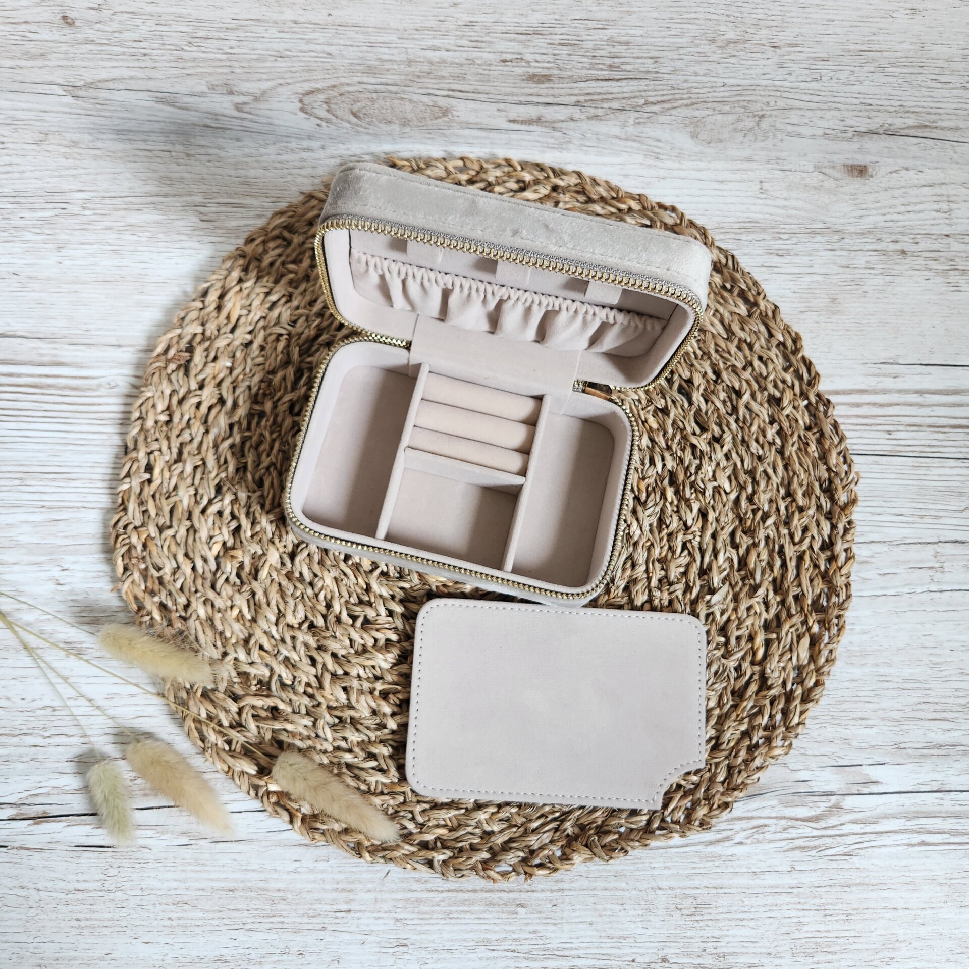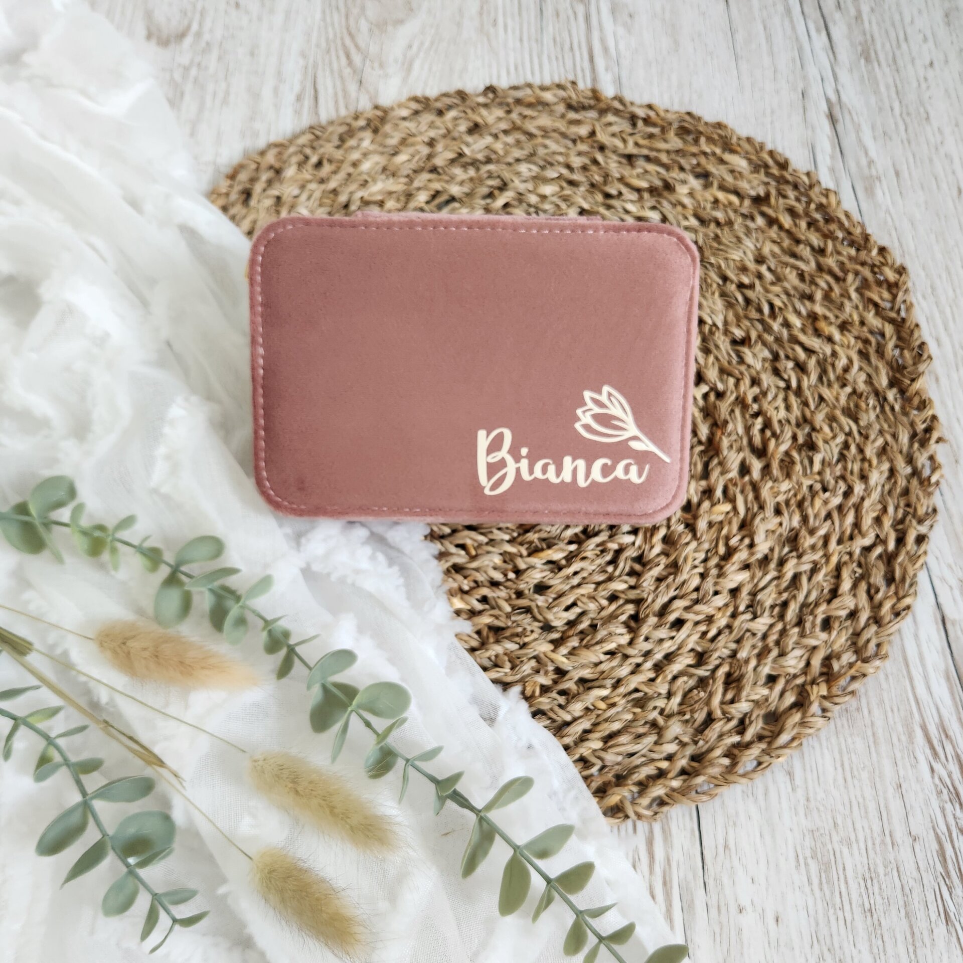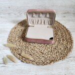 Dieses personalisierbare Schmuck-Etui ist der perfekte Begleiter für alle, die ihren Schmuck stilvoll und ordentlich aufbewahren möchten – ob zuhause oder auf Reisen.